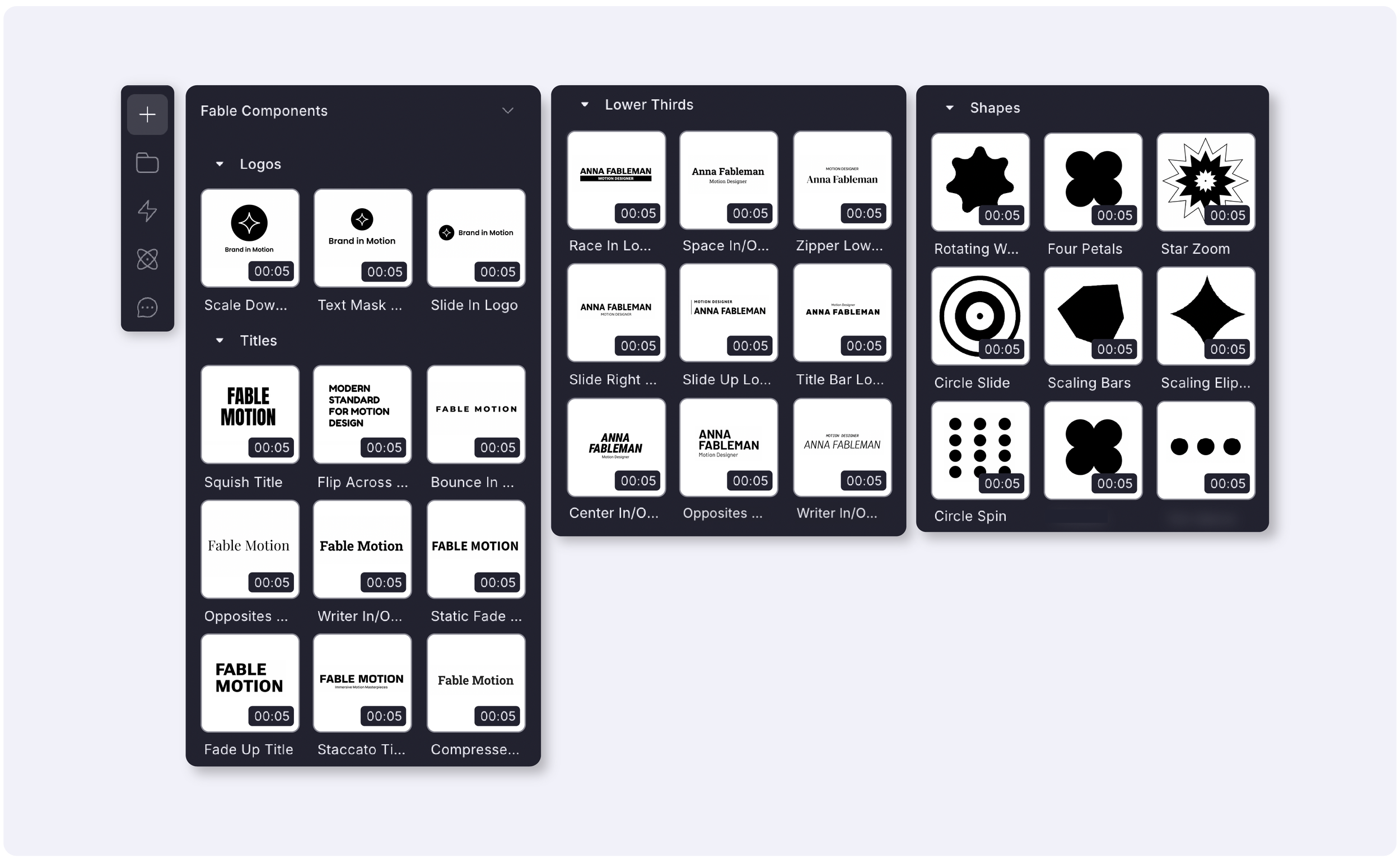 Fable is a cloud-based motion design platform where I collaborated with engineering and product teams to develop the Motion Library. This feature allows users to quickly add animation presets—such as logos, shapes, text, and backgrounds—to their projects, enhancing design components with quick-start options and reusability across all team projects.